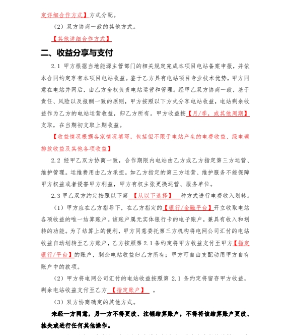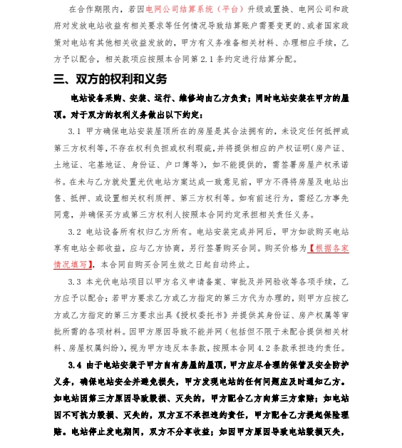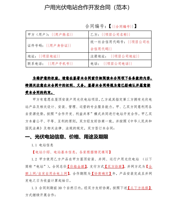 范本合同从电站规模、建造费用、收益结算、权益义务、运行维护、违约责任等多个方面,统一了户用光伏合作开发标准体系,填补了用户在专业知识方面的空白,从源头解决了从业公司众多导致合同文本多、规范性定义不清晰等问题。以下为“范本合同”: